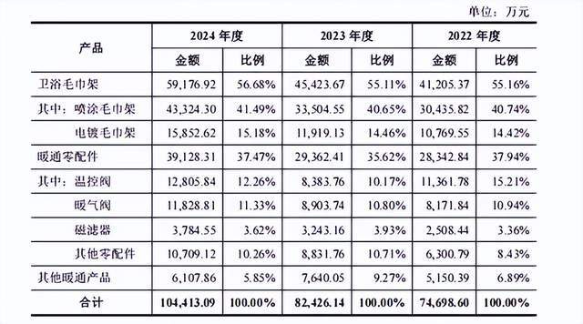 目前,艾芬达主营暖通设备,2024年主营收入10.44亿元,其中5.92亿元为卫浴毛巾架,其他为温控阀、暖通阀门、磁滤器等暖通通用零部件。