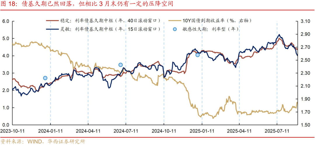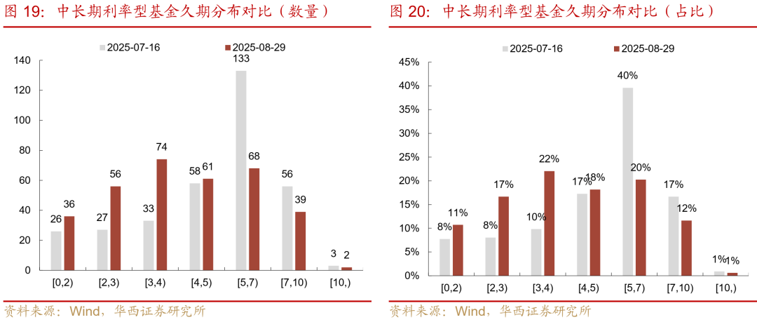 另一方面,债市内部的风险尚未完全出清,这部分可以通过基金久期进行观察。7月中旬以来,全市场久期中枢已经历了逐级下台阶的过程,参考更加灵敏的15日窗口久期模型,截止8月29日,利率债基久期中位数为4.01年(7月中旬、8月中旬分别为5.23年、4.70年)。不过与4月初对等关税落地前的3.32年相比,可能依然存在一定的压降空间,这一现象的背后,或是部分久期在5年及以上的产品,选择在调整行情中维持定力。