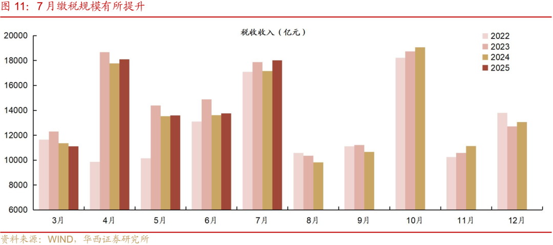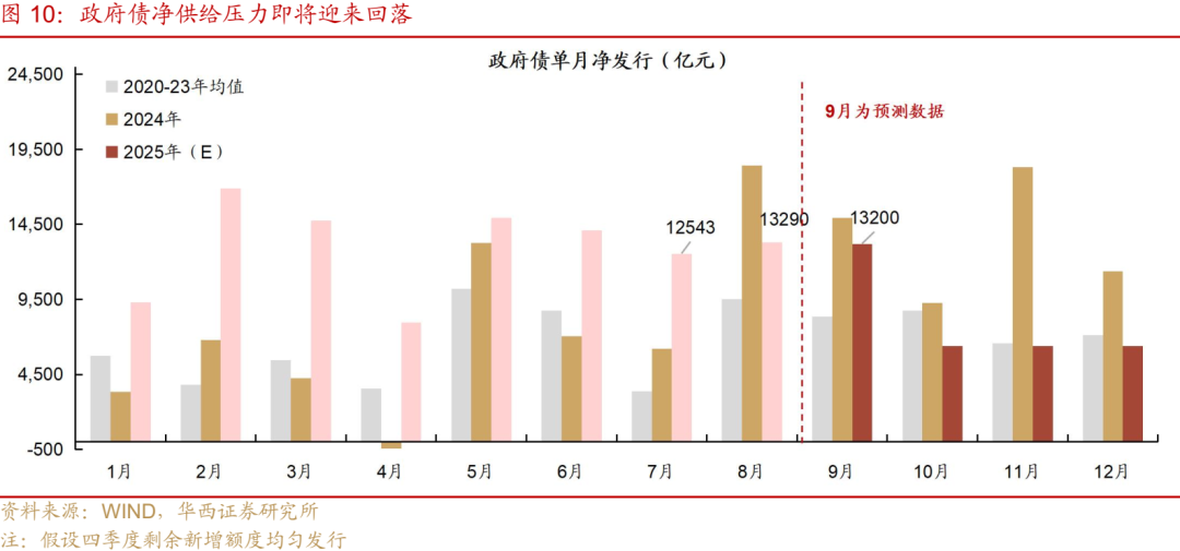 9 月资金大概率前紧后松,跨季扰动或将推动资金利率上行。首先,如果从历史经验来看,8 月过后,资金利率往往容易开始抬升,其背后原因主要有两个:其一,9月为跨季月,9月后双降落地概率不高;其二,过去几年政府债集中在年末发行。然而,2025年财政发力节奏则呈现“前快后慢”特征,9月及以后政府债供给压力不大,资金利率中枢有望逆季节性下行。