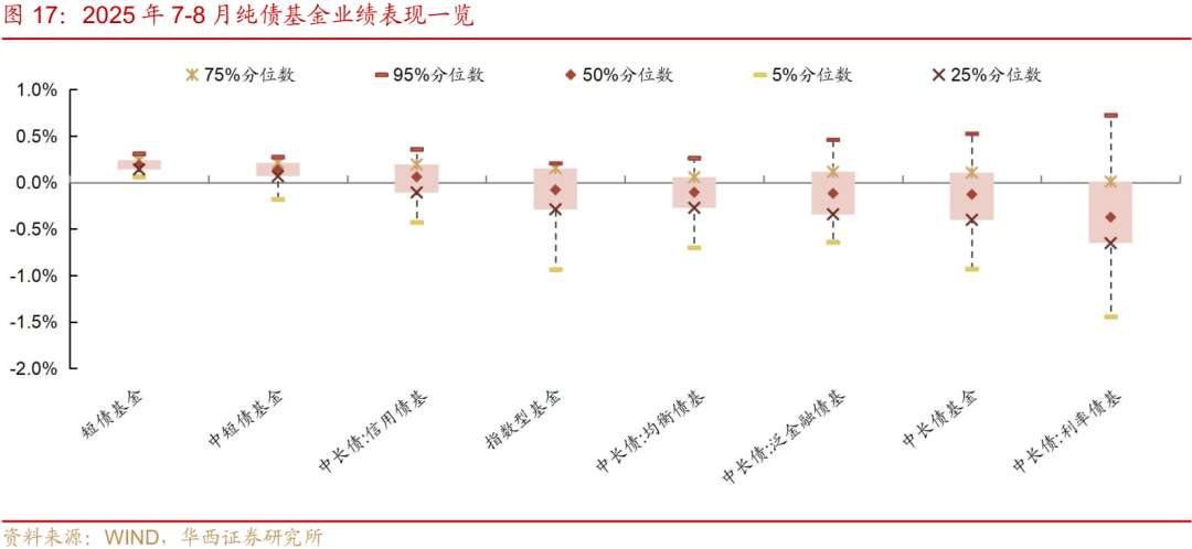 站在当下,与8月情形相似,尽管权益市场出现波澜,我们依旧无法轻易断言股市的上涨行情就此结束,债市在反击之前,先做好防守。一方面,7-8月长端利率连续上行,大部分固收产品在此期间或经历大幅回撤,低容错空间下,债市或不具备“豪赌”的基础,以公募债基为例,一览其在7-8的收益率表现,中长期纯债基金收益率中位数仅为-0.13%,其中利率型债基、金融型基收益中位数分别为-0.37%、-0.12%,信用型债基稍好一些,但收益率中位数也仅为0.06%。