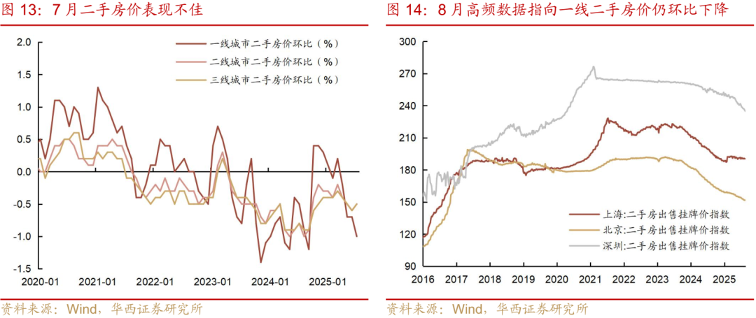 其次,在地产端二手房价格变化暂未出现积极信号。从二手房价变化来看,5-7月一线城市的地产销售开始面临较大挑战,二手房价格月环比跌幅快速走扩,分别为0.7%、0.7%、1.0%;二、三线城市二手房价格月环比跌幅则维持在0.5-0.6%水平。同时从高频数据观察,8月第三周上海、北京、深圳二手房挂牌价格指数较上月同期再下滑0.1%、0.9%、1.2%,并不算积极信号。