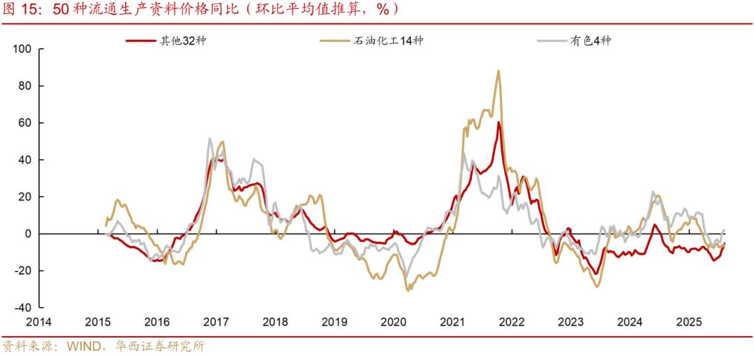 再者在通胀方面,“反内卷”政策支撑下,通胀数据或边际回升,但倘若需求支撑不足,中下游对上游涨价接受度偏低,商品涨价或面临一定阻力。一方面,从8月制造业PMI来看,原材料购进价格指数、出厂价指数延续反弹趋势,不过价格涨速放缓;同时我们也注意制造业原材料价格涨幅仍然显著高于出厂价涨幅,相当于中下游加工型企业的利润反而被压缩。另一方面,利用50种流通生产资料价格的平均环比变化,反推价格的同比涨幅,8月下旬与制造业相关性更强的14种石油化工商品价格的同比变化为-6.33%,7月下旬为-7.49%,反映8月PPI同比数据或较7月有所改善,但最终变化幅度可能不算特别显著。此外,商品期货情绪已经全面走弱,也表明基本面因素可能并不支持商品价格持续上涨。