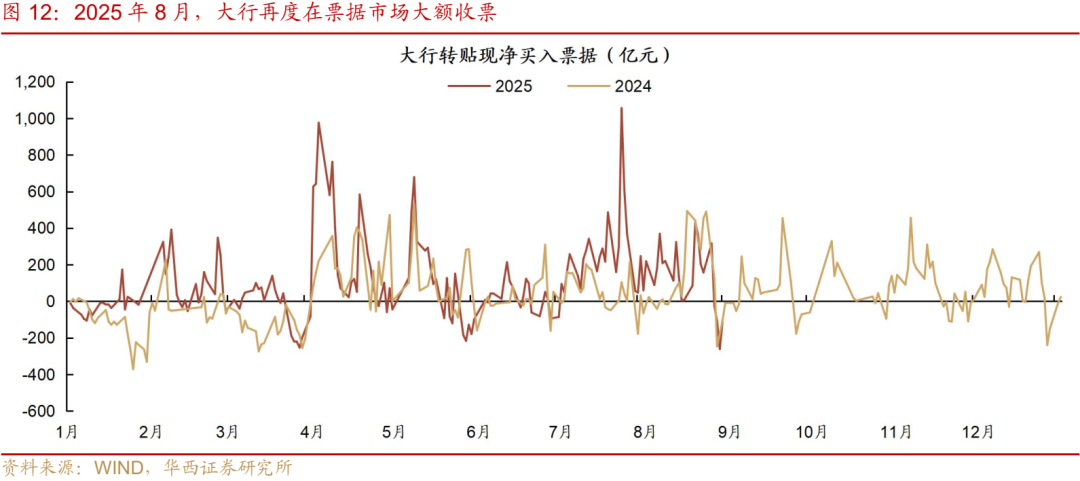 首先,在需求端可惯例跟踪票据指标。大行虽在8月末最后四个交易日持续净卖出票据,但8月全月累计净买入票据2924亿元,与2024年8月的2401亿元规模相当。票据利率方面,1M票据利率维持季节性规律,月末前夕再降至零值附近。回顾去年同期信贷数据表现,新增贷款规模虽略高于市场预期,但冲量属性较强的新增表内票据起到了重要的支撑作用,企业与居民两大主体的实际贷款需求依旧偏弱,而在数据出炉不久后,市场便迎来“924”降准降息组合拳。