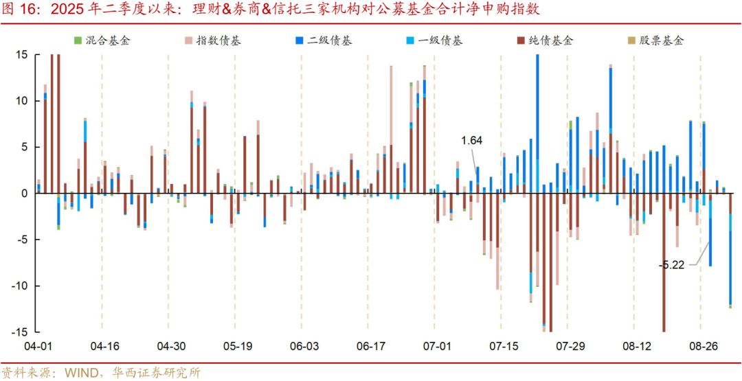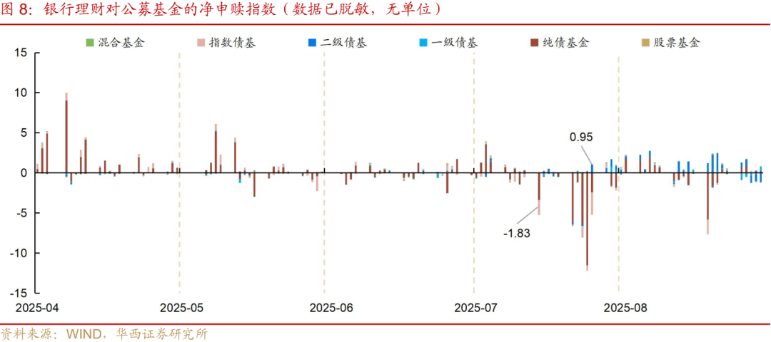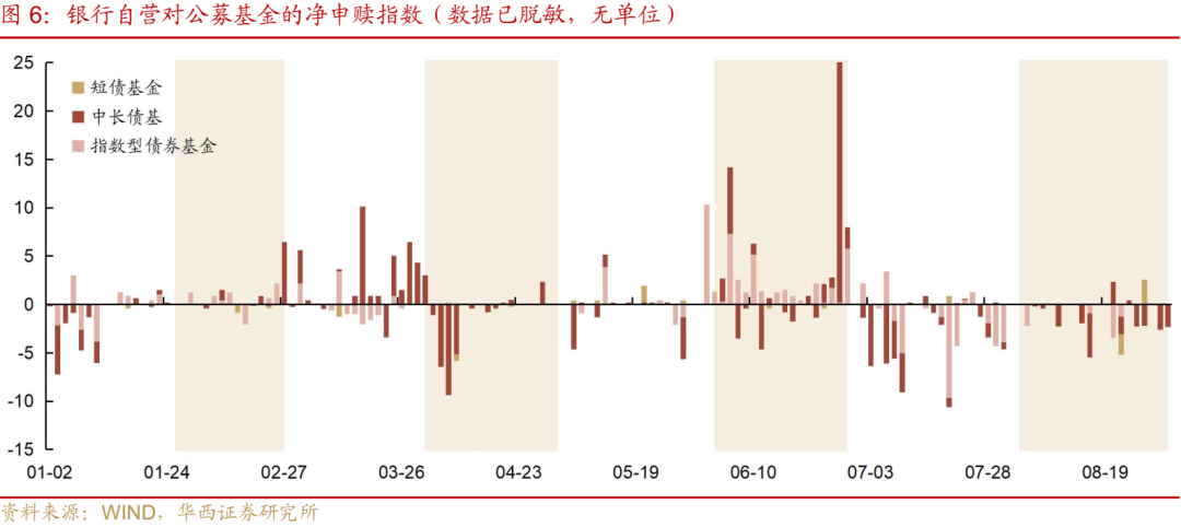 在浮盈快速变薄的背景下,银行的行为可能愈发谨慎,同时其兑现收益的诉求进一步上升。我们可以从两个线索得到印证:一是大行持续的“卖长买短”行为,或与其兑现盈利调节报表有关。自5月末以来,大行开始连续增持1年内、1-3年国债,6-8月期间累计净买入1年内、1-3年国债3219、5516亿元;而5年及以上的中长久期国债,大行多维持卖出操作,且期限越长卖量越大,6-8月累计净卖出7-10年、10年以上国债347、1612亿元。二是银行对公募债基的申赎行为。据第三方交易平台数据,自7月“反内卷”行情启动以来,银行连续赎回中长债基以及指数债基,7月累计净赎回指数为-25,为全年之最。随着8月债市行情重新走弱,银行自营从下半月起再度加力赎回债债基,全月累计净赎回指数为-17。