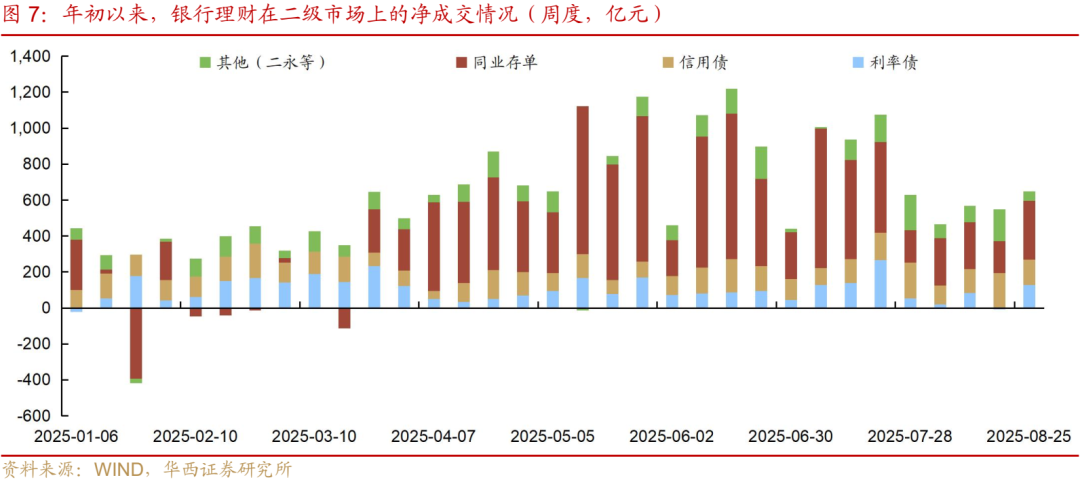 此外季末月,市场对银行理财行为的关注度也上升。不过我们倾向于,尽管理财规模存在明显的季末回表特征,但其对于债市收益率的影响力可能相对有限。一方面, 7月理财规模高增,其主要配置品种是存单而非债券,7-8月理财自有账户净买入存单3333亿元,而信用债、利率债、二永等仅净买入1250、860、870亿元,而包含了理财通道的其他资管产品,7-8月净买入存单3983亿元,信用债、利率债仅净买入1293、113亿元。另一方面, 6月以来银行负债压力缓解,其背后主要是信贷需求转弱,因而对理财规模回表的诉求也相应下降。