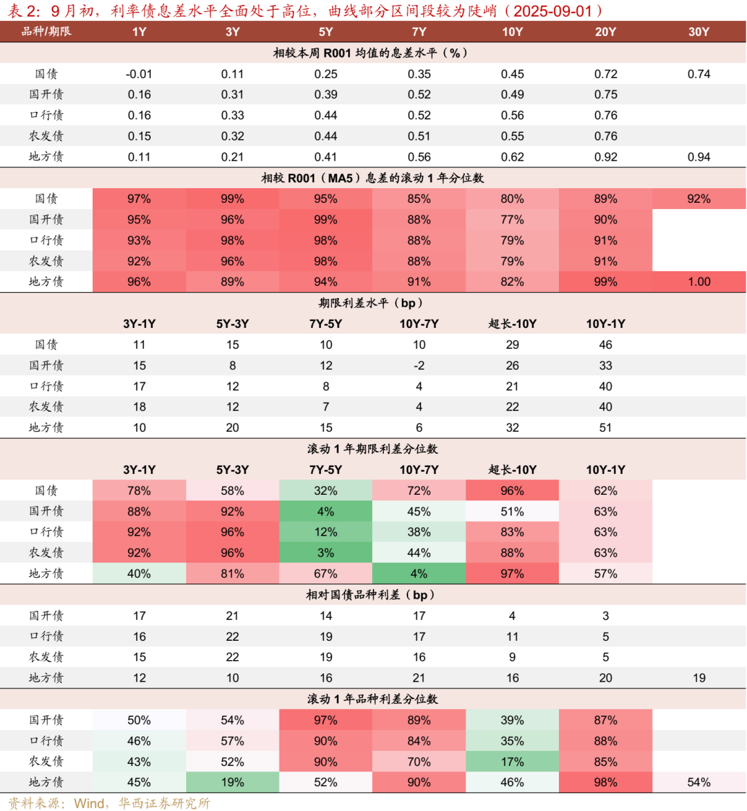 因而我们将9月划分为三个阶段,上旬的“观察期”,中旬的“博弈期”,月末的“捡漏期”。观察期,高胜率策略或是首选,当前利率债选项中,各品种、各期限息差水平均处于滚动1年90%之上的极高分位数,叠加未来一段时间内资金面大幅波动的可能性不大,“加杠杆”可作为策略基底,相对应目标久期则可定于3.5-4.0年左右的中性水平,恰好当前各品种曲线1至5年段均较为陡峭,同时也可采用哑铃型持仓,提升组合的抗风险能力。