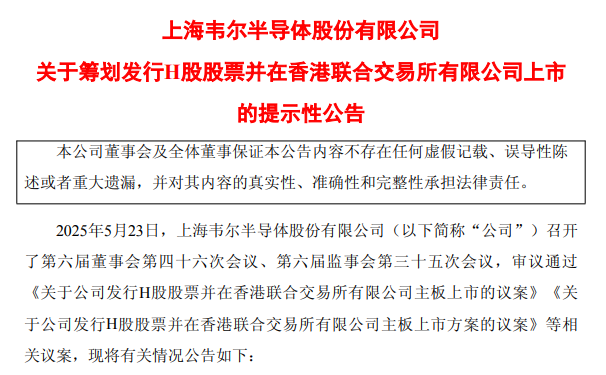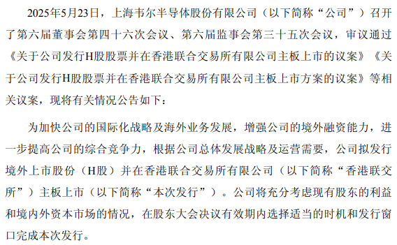 5月23日晚间,韦尔股份披露,为加快公司的国际化战略及海外业务发展,增强公司的境外融资能力,进一步提高公司的综合竞争力,公司拟发行境外上市股份(H股)并在香港联交所主板上市。