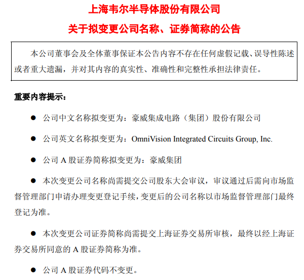 就在前几日,韦尔股份刚发布了更名公告。