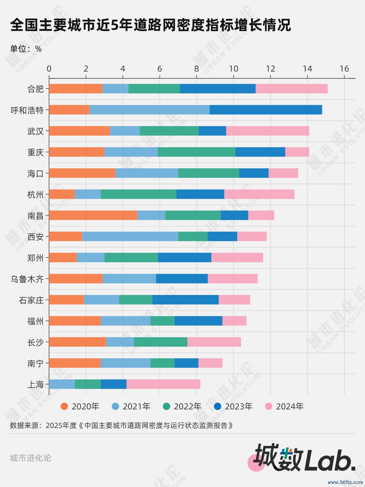 将时间线拉长至五年,合肥一举拿下“增速冠军”,道路网密度从7.0km/km²提升至7.9km/km²,累计增长约15.2%。