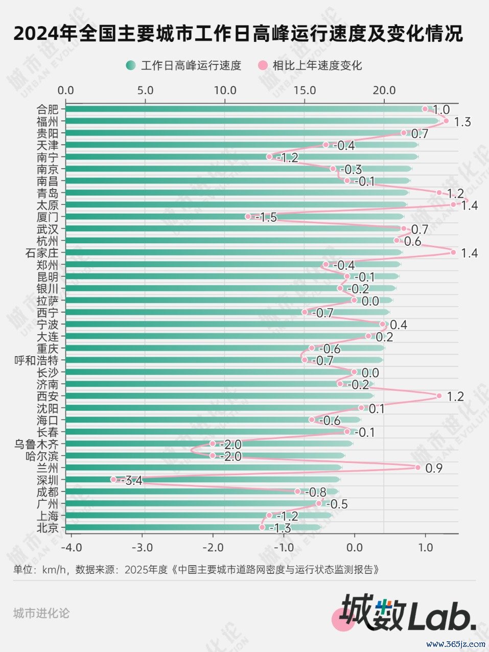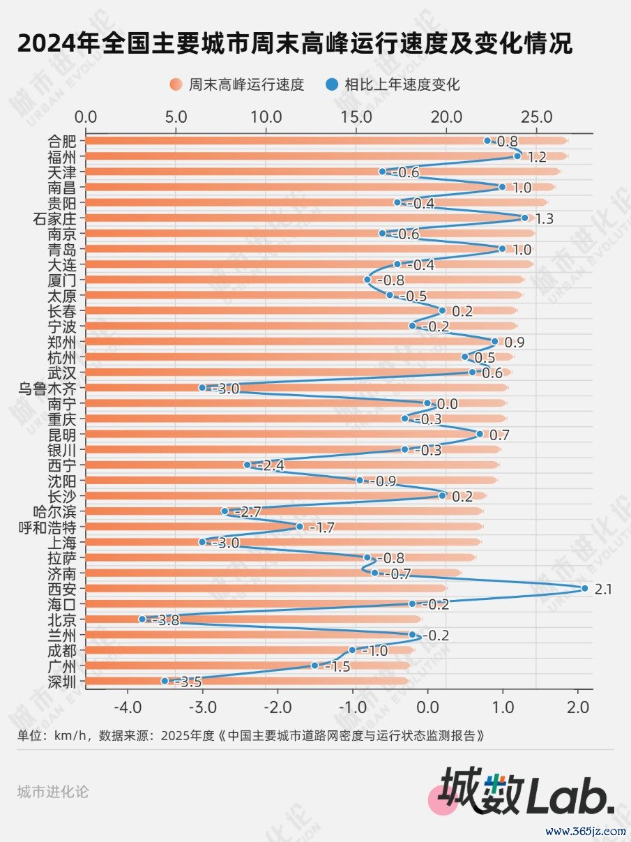 如果将路网密度比作人体毛细血管的密度,车辆运行速度就好比血液的流动速度。从监测数据看,在加密路网方面表现亮眼的合肥,2024年也是工作日及周末高峰运行速度最快的城市,领跑36个主要城市。