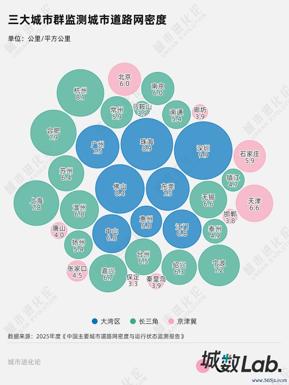 2024年道路网密度增长最多的城市中,杭州、合肥、上海、武汉分别提高0.3km/km²,郑州、长沙、南京、长春则分别提高0.2km/km²。这里面,有一半城市来自长三角。从三大城市群监测数据看,长三角城市同样几乎包揽2024年密度增长“第一方阵”。