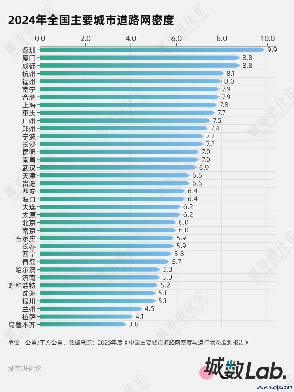 道路网密度,即单位平方公里内道路的总里程。中国城市规划设计研究院日前发布2025年度《中国主要城市道路网密度与运行状态监测报告》,截至2024年,全国36个主要城市平均道路网密度6.6km/km²,其中仅深圳、厦门、成都、杭州和福州达到8km/km²的标准。