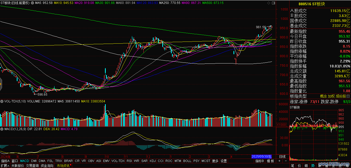 节前最后一个交易日(5月30日)融金牛,沪深股市在创业板单边下跌的影响下普遍走弱。从盘面看,受*ST锦港实锤财务造假进入退市程序的影响,活跃了11个月的ST板块回落。