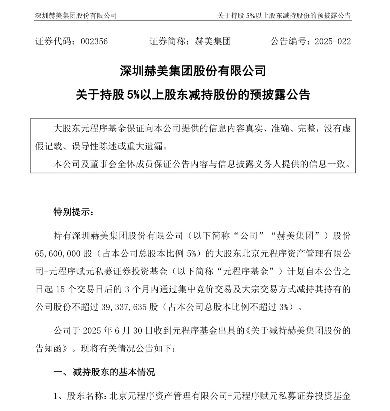 6月30日牛领策略,赫美集团(002356.SZ)公布,持有公司股份65,600,000股(占公司总股本比例5%)的大股东北京元程序资产管理有限公司-元程序赋元私募证券投资基金(简称“元程序基金”)计划自公告之日起15个交易日后的3个月内通过集中竞价交易及大宗交易方式减持其持有的公司股份不超过39,337,635股(占公司总股本比例不超过3%)。