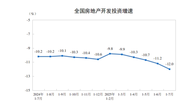 1—7月份,房地产开发企业房屋施工面积638731万平方米,同比下降9.2%。其中,住宅施工面积445107万平方米,下降9.4%。房屋新开工面积35206万平方米,下降19.4%。其中,住宅新开工面积25881万平方米,下降18.3%。房屋竣工面积25034万平方米,下降16.5%。其中,住宅竣工面积18067万平方米,下降17.3%。